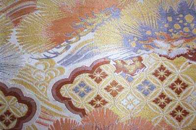 TAISHO ERA (1912-1926) SILK BROCADE MARU OBI WITH NISHIKI PINE BOUGHS AND DIAPER PATTERNSThe silk brocade is woven with gold and silver metallic threads and color silk threads to create a shimmering cloth known as nishiki weave. The pattern is composed of exaggerated pine boughs alternated with ornate diaper designs. The colors are copper, gray, and yellow gold, orange, white, and silver on an light beige field. The obi is in good condition. 12 x 148