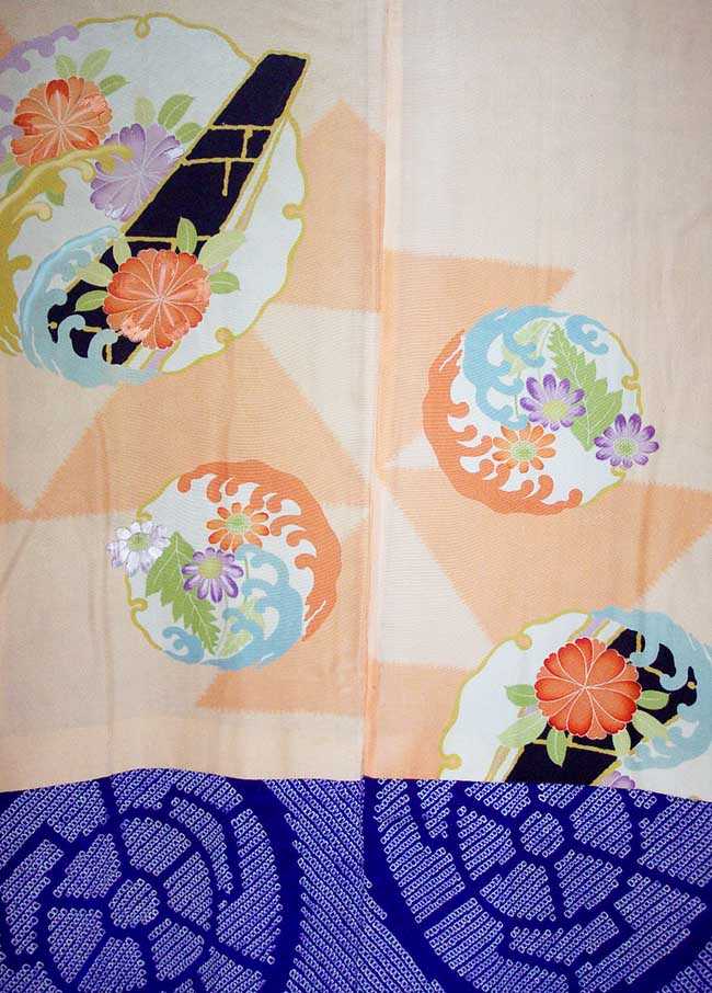 TAISHO ERA (1912-1926) PURPLE SHIBORI HAORI WITH YOKOBIKI KANOKO WHEEL DESIGNThe silk for this lovely haori is woven in a fine lightweight cloth. The tie-dye pattern is made up of square ring dots called yokobiki kanoko. Using this tie the artist created a design of wheels. The ties dyed rings are somewhat irregular in size and form. In this haori the shibori dots are pressed flat. Please notice this haori and its sleeves are extra long. The jacket is completely lined in an ornate silk. The linings pattern features snow wheels with flowers and water symbols. Some of the flowers are hand embroidered. The design makes us think of a flower boat motif. The lining has some small stains and a tiny hole but these do not show on the outer garment. The outer haori is in good condition. Dimensions: from sleeve tip to sleeve tip 49”wide x 39” long, sleeves 24.5” long US$325 - SOLD