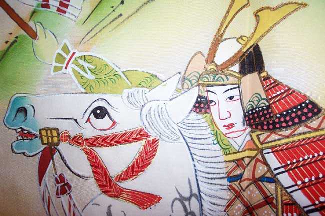 PRE WW II MIYAMAIRI BOYS CEREMONIAL KIMONO WITH SAMURAI WARRIOR ON HORSEBACK AND MEYUI MONThe kimono is made of the finest silk that has been hand painted in the bold design of a Samurai warrior on horseback. The design includes mountains and pine trees in the background. There are battle flags in the distance. Free hand Yuzen is the ultimate in kimono decorating. About thirty days after a Japanese baby is born, it is taken to the Shinto shrine for its first shrine visit. This occasion is called miyamairi and the kimono used for that day is a special garment. The event is comparable to our christening. The miyamairi kimono (christening dress) is actually draped around the infant while the kimono’s ties are loosely draped about the mother’s neck. Miyamairi is the formal event by which the child becomes a parishioner of a Shinto shrine. This antique kimono is fully lined. it has five family crests in the meyui (four square eyes) motif. The Kimono is in Excellent Condition. Dimensions: 33” Wide from sleeve tip to sleeve tip X 39” Long from shoulder to hem. US$650 - SOLD