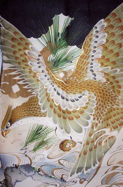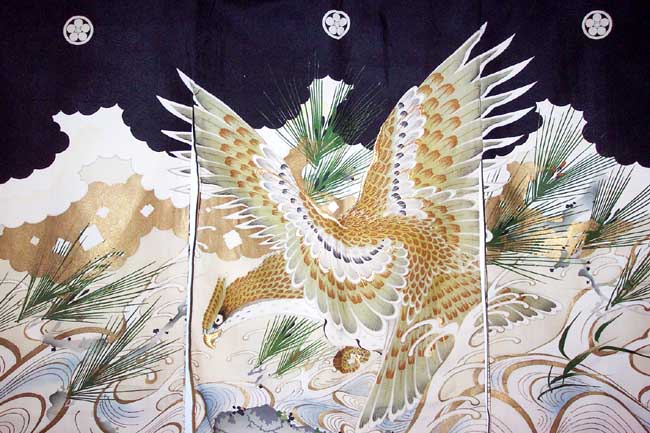 ANTIQUE BOY’S MIYAMAIRI KIMONO WITH HAWK AND PINE OVER WATER WITH UMEBACHI MONThis is a stunning example of a Pre WW2 Japanese Boy's Kimono. The miyamairi kimono (christening dress) is made of fine lightweight silk. it is decorated by free hand painted design. A huge hawk sits in a pine tree above swirling waters. The hawk has gold embroidered wing tips and outlining. The pine tree has golden painted accents. Bamboo leaves are featured in the design. The total composition captures a feeling of power and great strength. A miyamairi kimono is actually draped around the infant while the kimono’s ties are loosely draped about the mother’s neck. Gold paint and gold embroidery are used extensively in the design. It has five family crests in the umebachi (plum blossom) motif. The kimono is fully lined and the lining has some light stains. They do not show on the outer garment. Kimono Dimensions: 36” Wide from sleeve tip to sleeve tip X 38” Long from shoulder to hem. The sleeves are 22” long. US$450 - SOLD